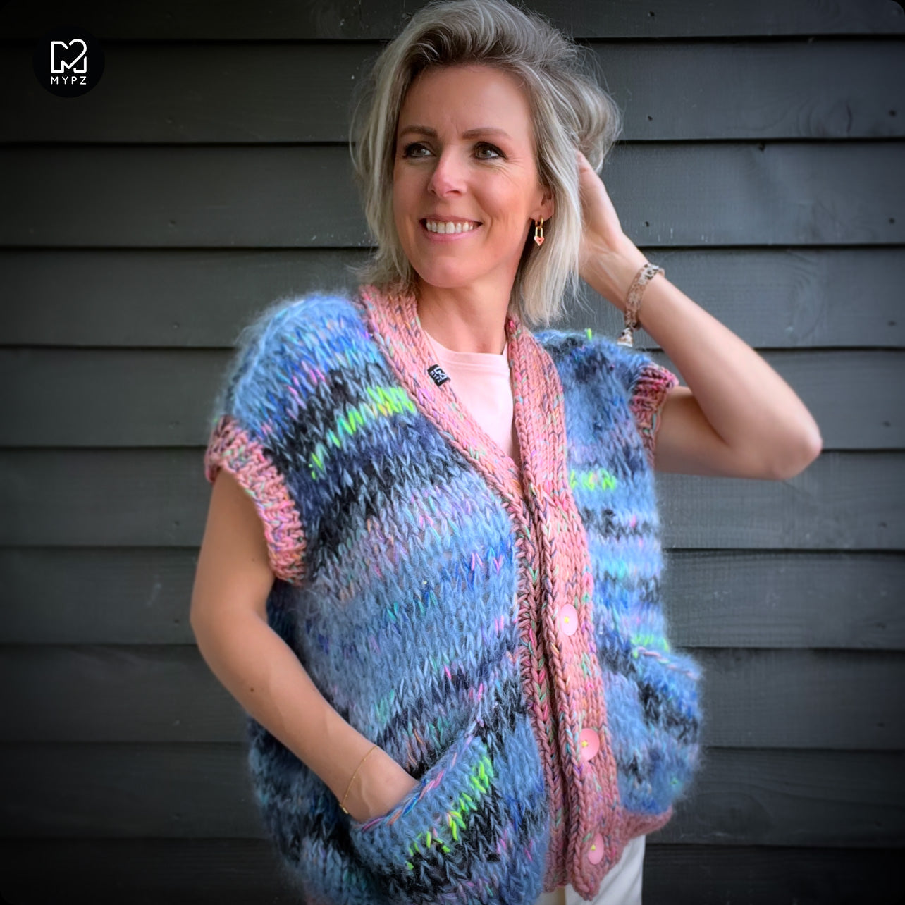 Use of color: This bodywarmer requires you to tie many pieces of yarn together. Cut random lengths of each color (we have used lengths of ± 140cm) . The longer your piece of yarn, the wider that color will be in your cardigan. Tie all the lengths together into a large ball. You need to make tight knots! These knots can be visible in your work (we like that!)