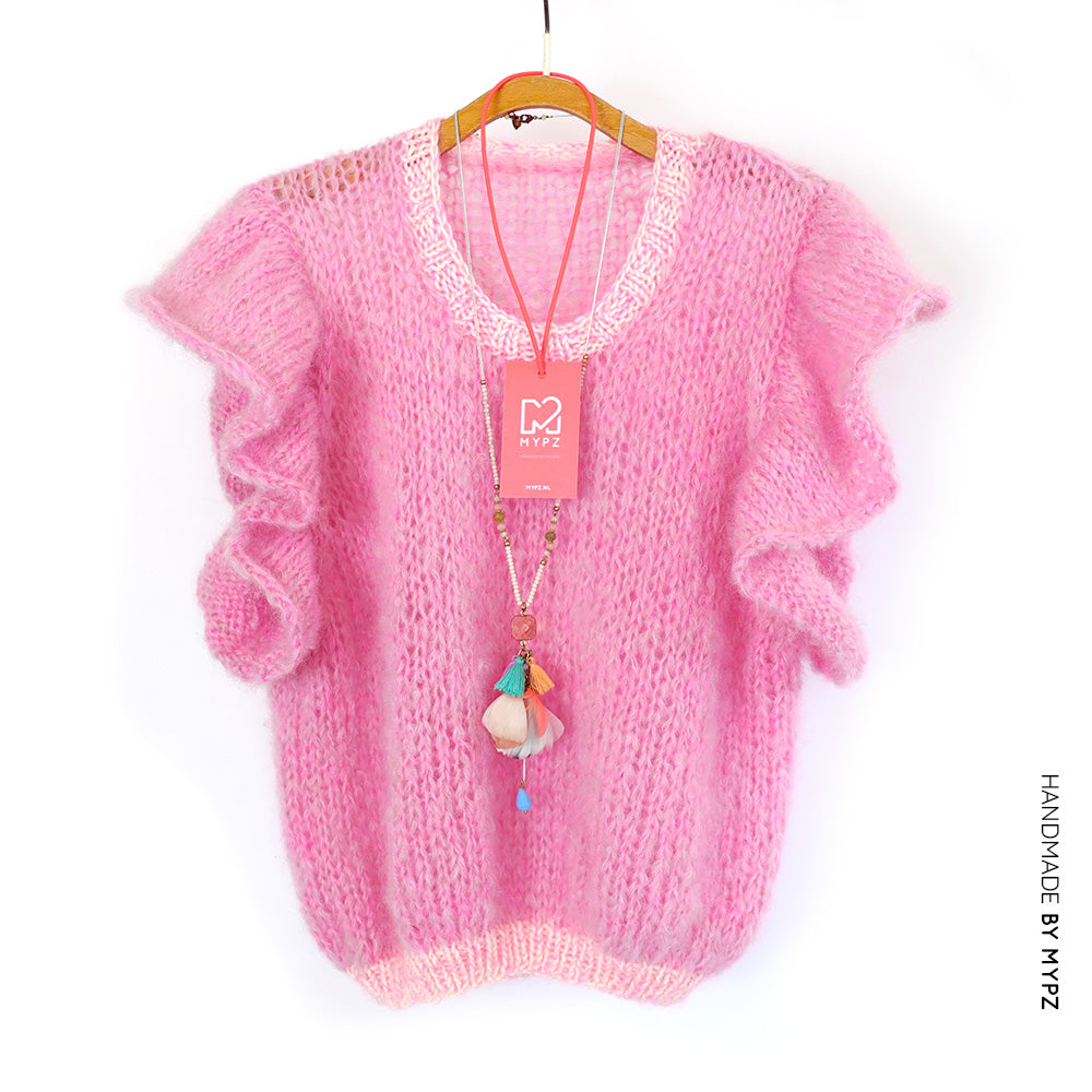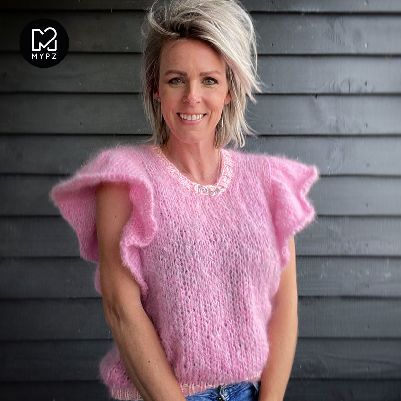 Yarn: You knit this top with 1 strand MYPZ chunky kidmohair DK Light Pink + 1 thin strand MYPZ kidsilk Lace Candy Pink.