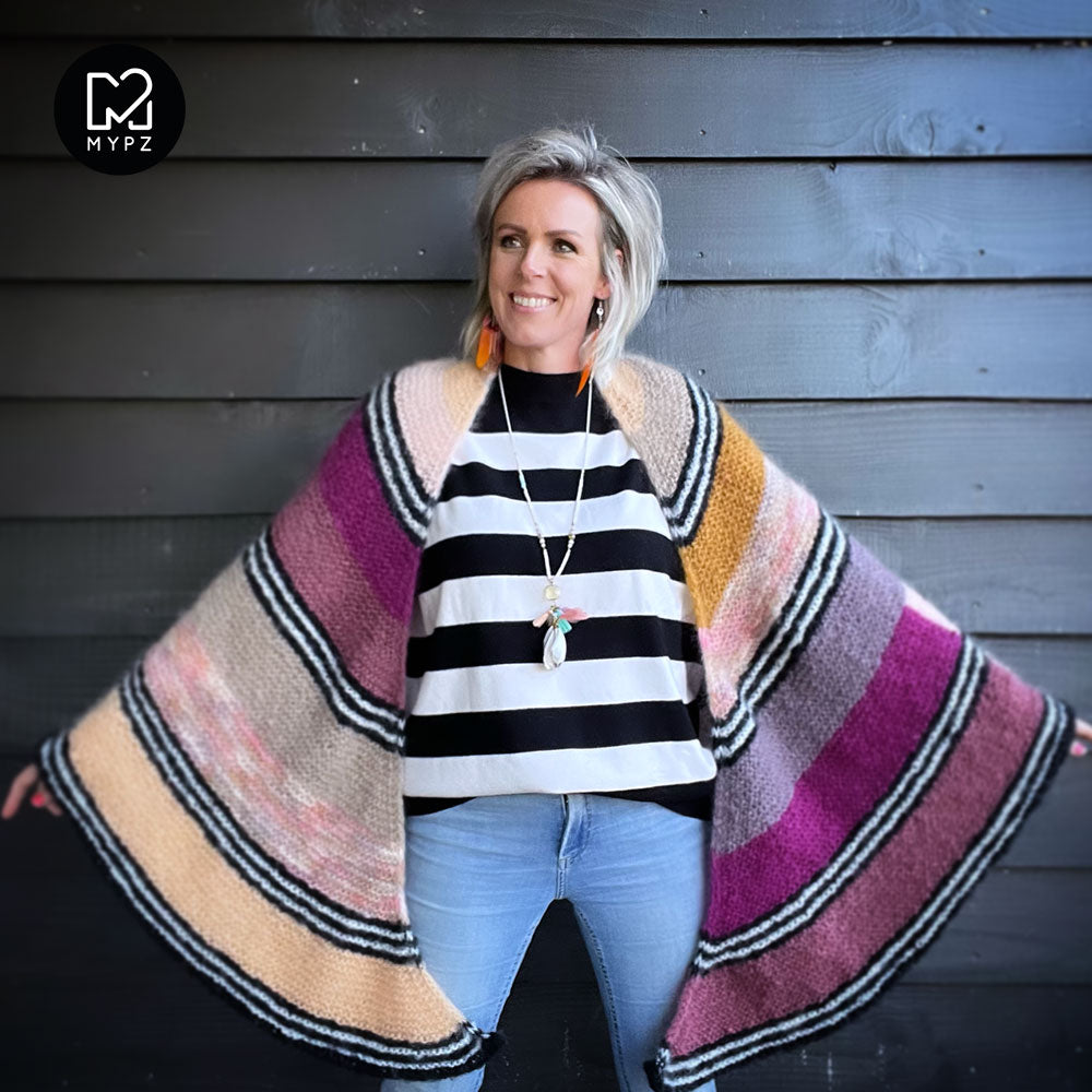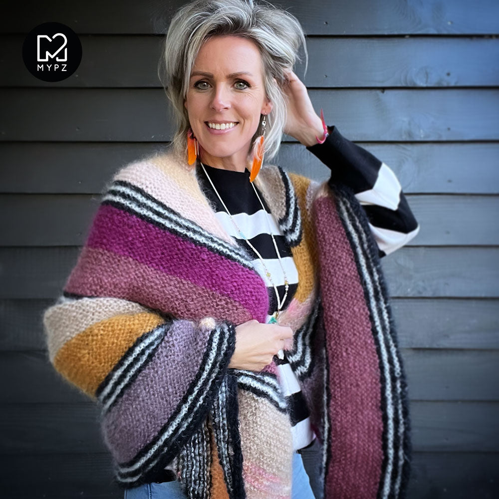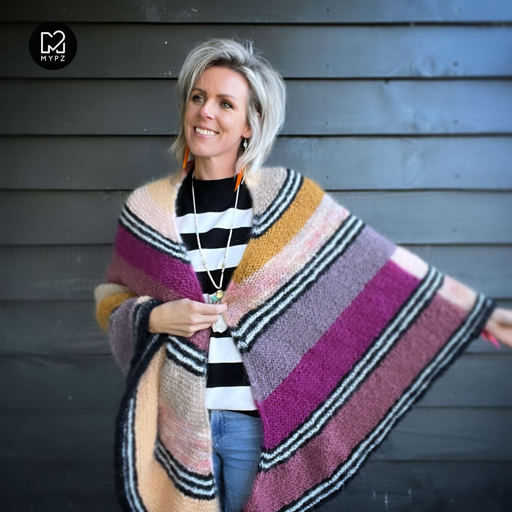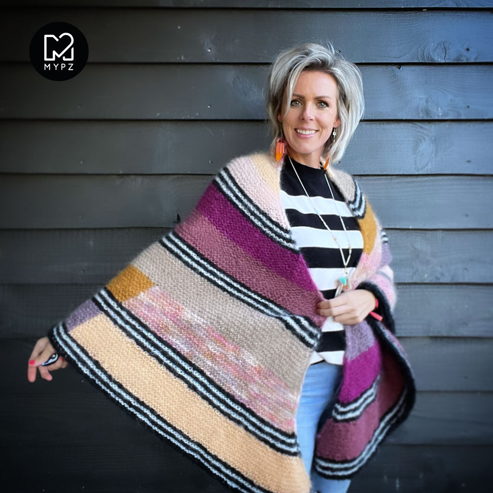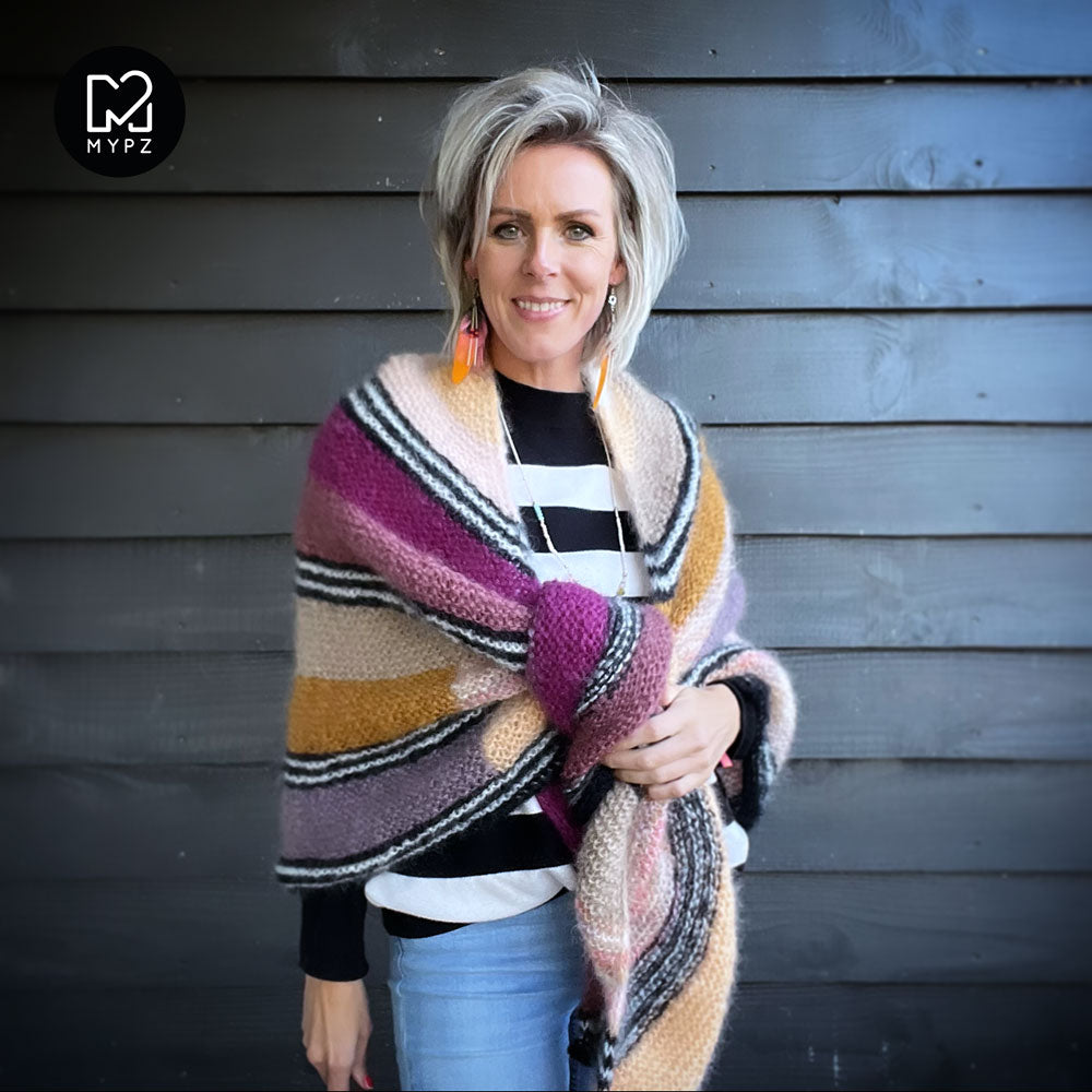 This soft warm shawl is a pleasure to wear and lightweight. This kit contains MYPZ Chunky Kidmohair DK, a high quality fine brushed mohair that does not pill.