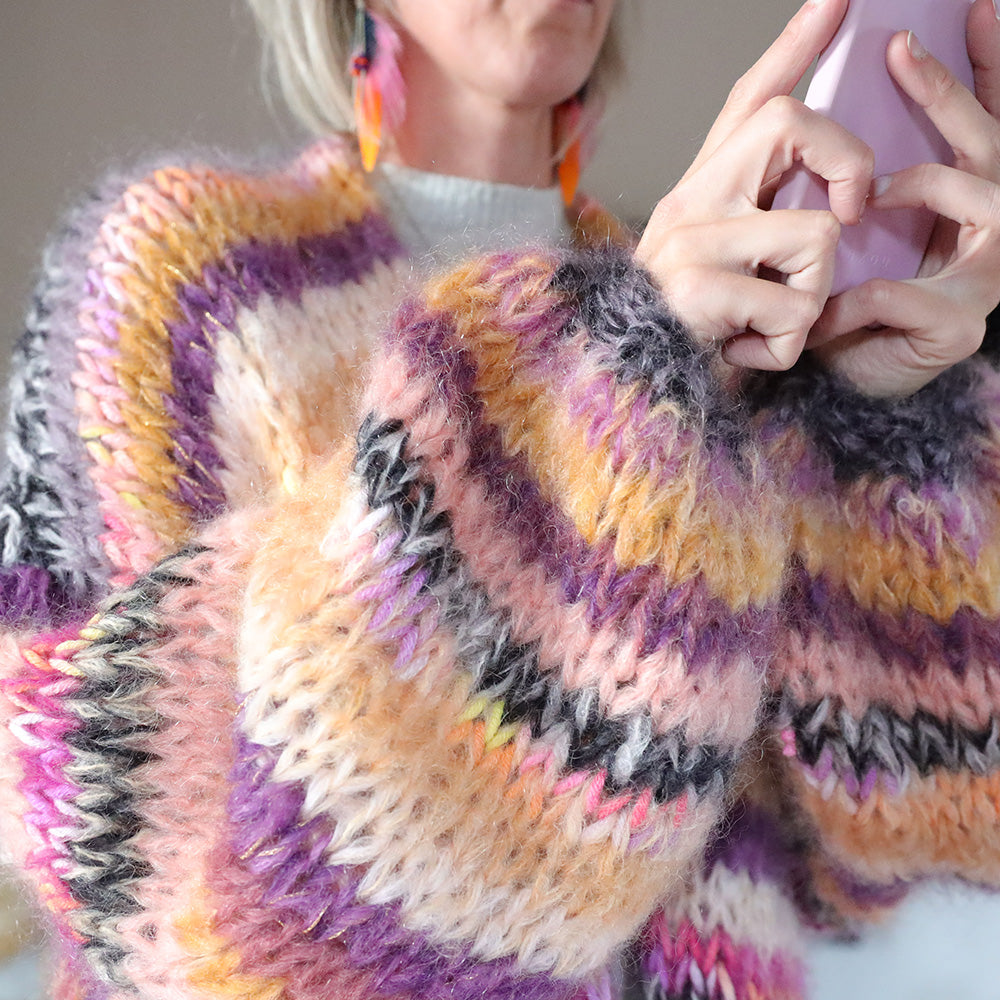 It’s very light, warm and comfortable. This kit contains MYPZ Chunky Kidmohair, a high quality fine brushed mohair that does not pill. These brushed yarns may shed a little but after a while this will subside.