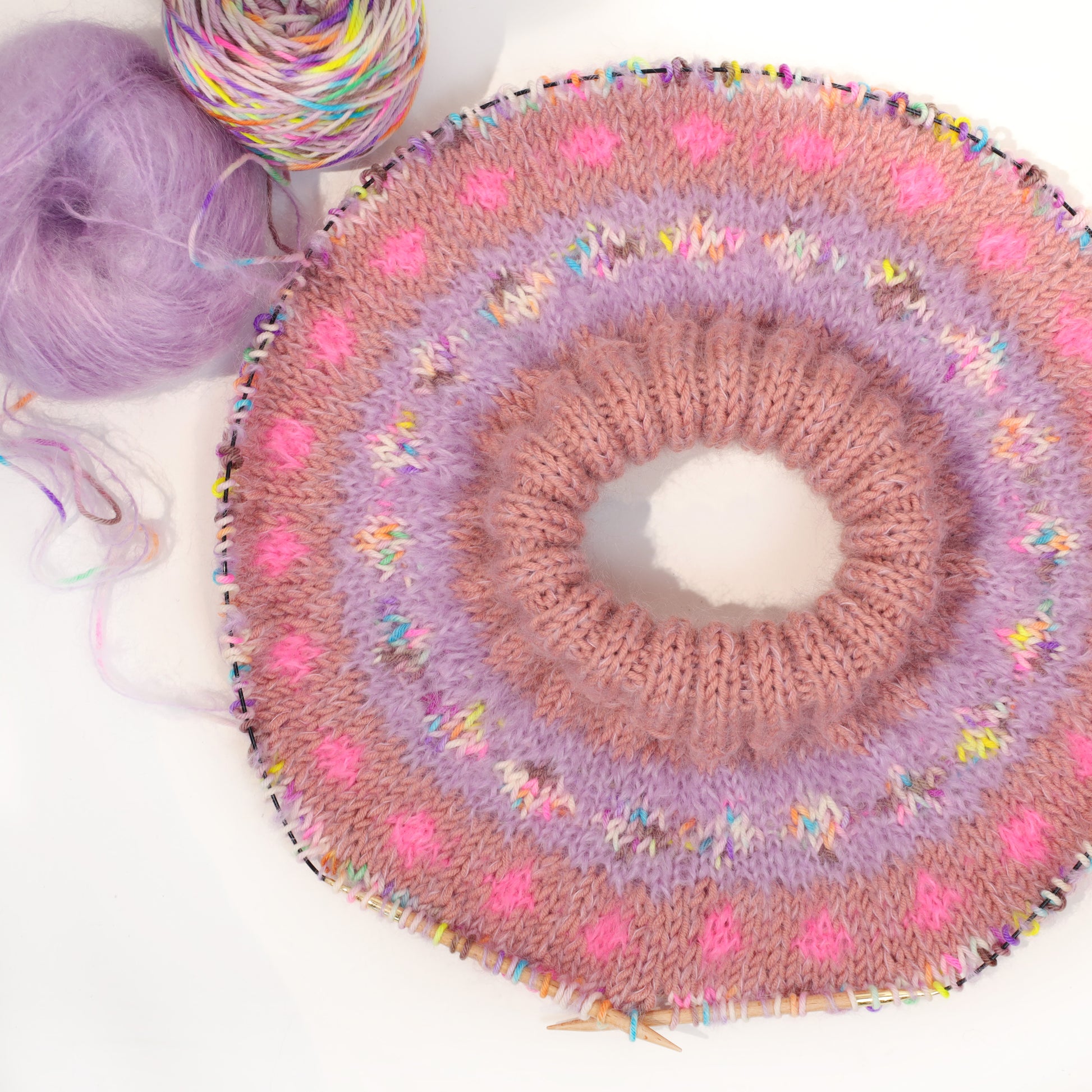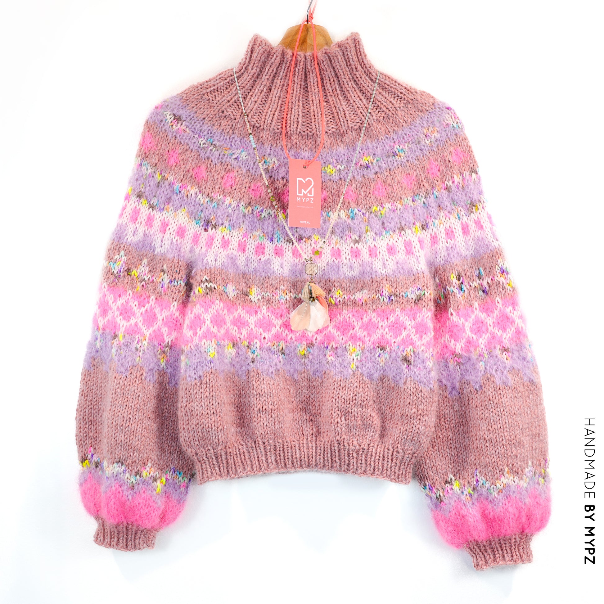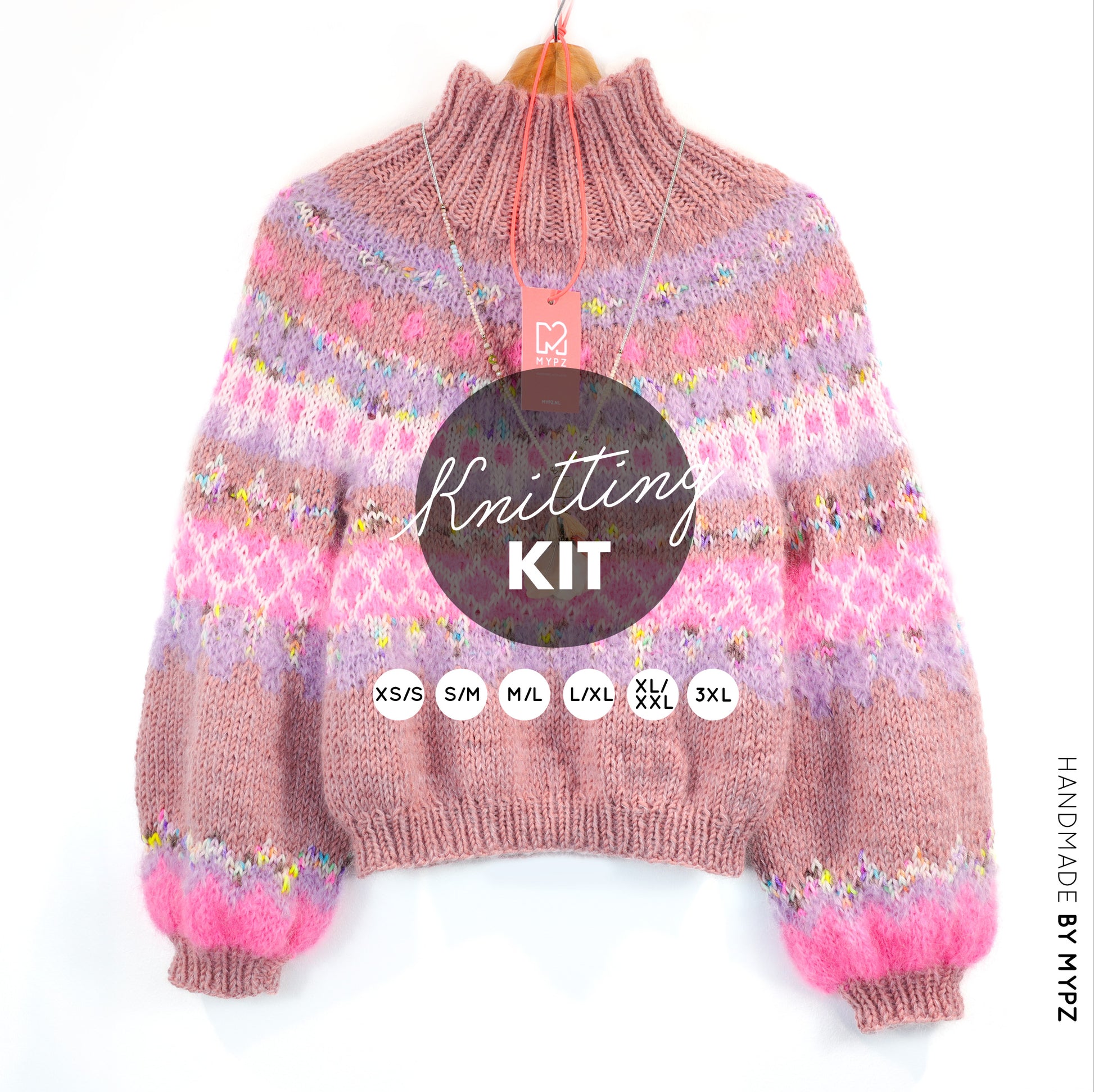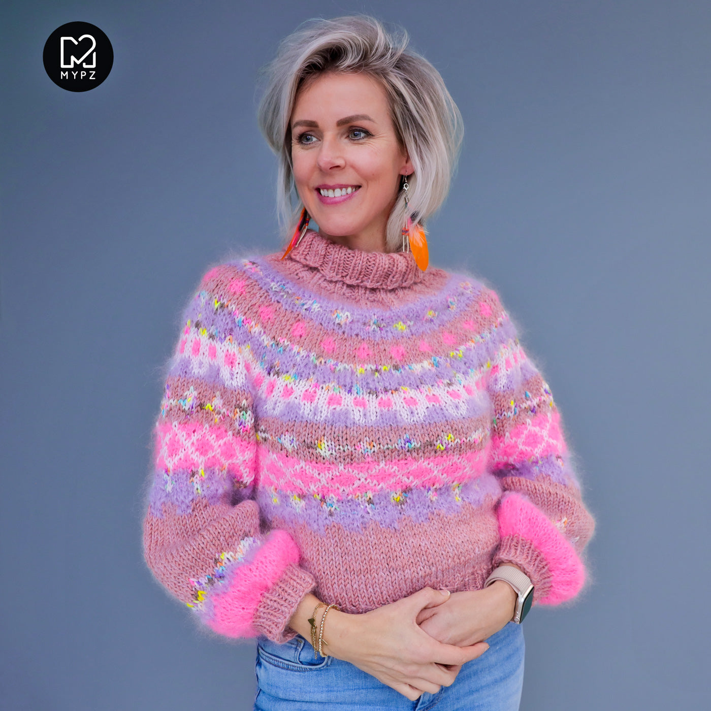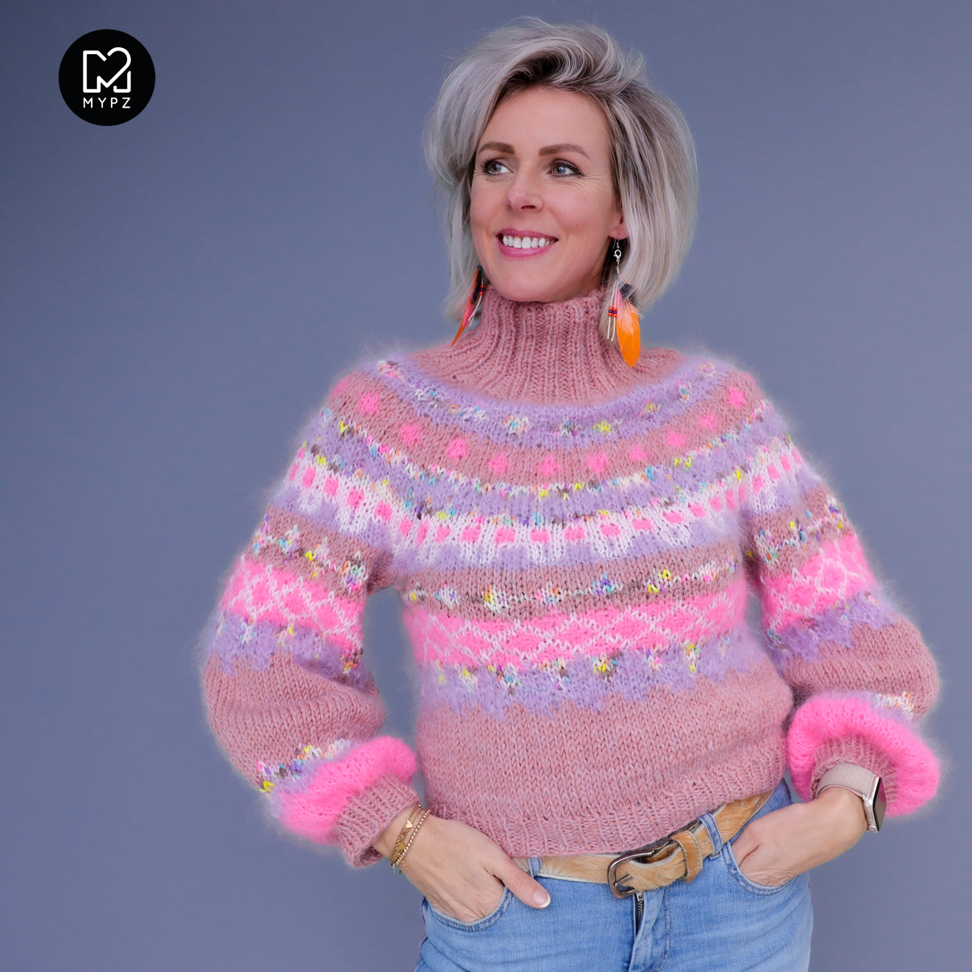 !! Bei dem Pullover auf dem Foto haben wir die Farbe MYPZ Super Soft Merino DK Warm Rosé zusammen mit 1 Faden MYPZ Kidmohair Light pink gestrickt. Dieses Kid Mohair juckt bei manchen und da es im Kragen des Pullovers und am unteren Teil sitzt, kann man es einfach weglassen. Es gibt keinen großen Unterschied, wenn man es weglässt. Aus diesem Grund haben wir uns entschieden, es nicht standardmäßig dem Kit beizufügen. Auf Wunsch können Sie es hier separat bestellen: MYPZ Kidmohair Light pink
