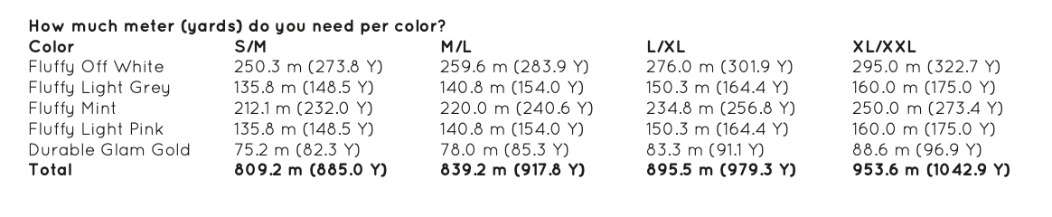 Wie viel Garn benötigen Sie, basierend auf den Farben im Bild für Größe S/M, M/L (L/XL & XL/XXL):